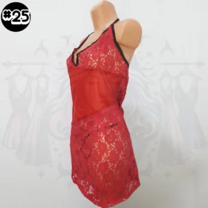 بيبي دول على شكل قميص نوم شوميز و سليب داخلي جي-سترينغ لون احمر غامق دونتيل و تيل، مجموعة لانجري تتكون من قميص نوم فضفاض قصير