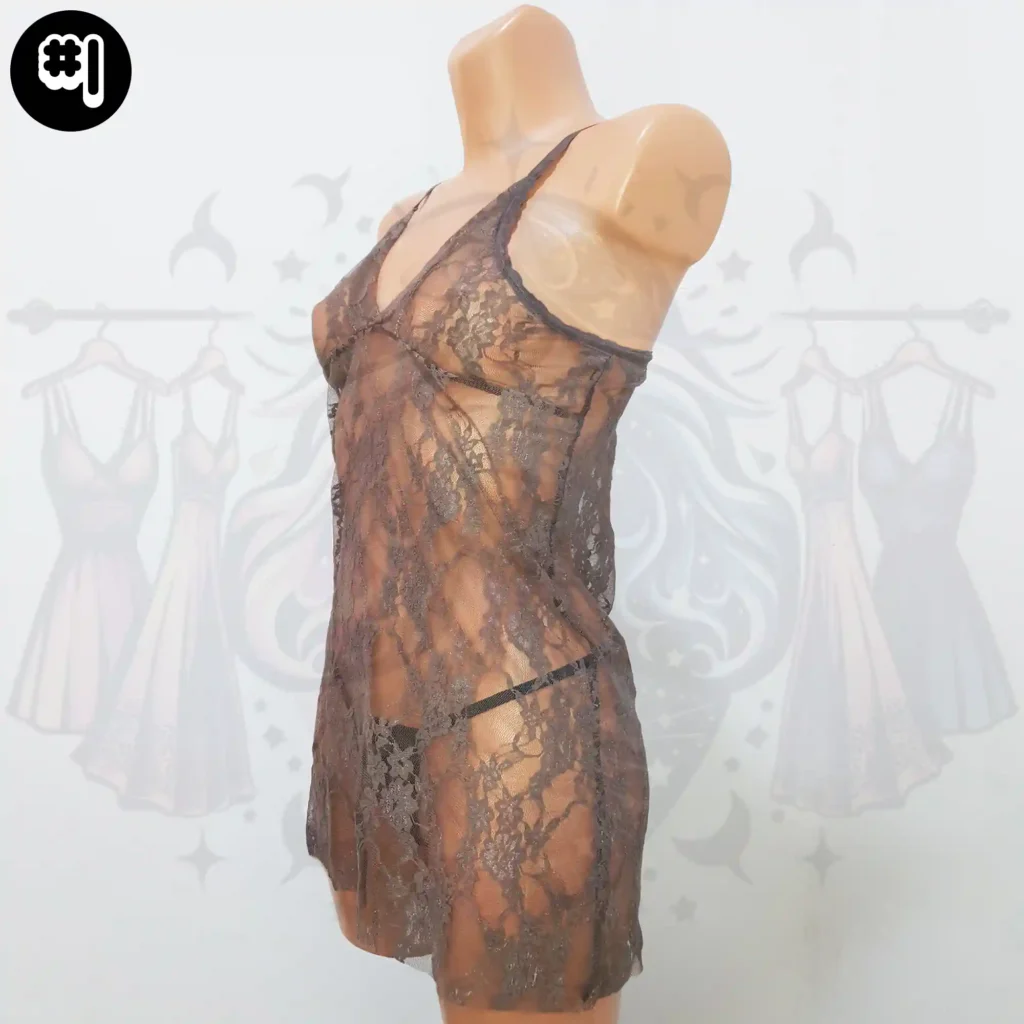 بيبي دول على شكل قميص نوم شوميز و سليب داخلي جي-سترينغ لون بني دونتيل، مجموعة لانجري تتكون من قميص نوم فضفاض قصير