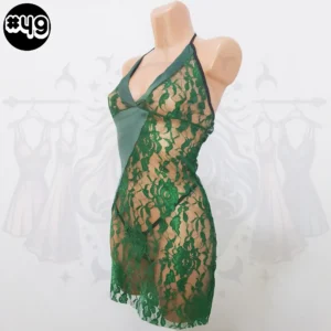 بيبي دول على شكل قميص نوم شوميز و سليب داخلي جي-سترينغ لون اخضر دونتيل، مجموعة لانجري تتكون من قميص نوم فضفاض قصير