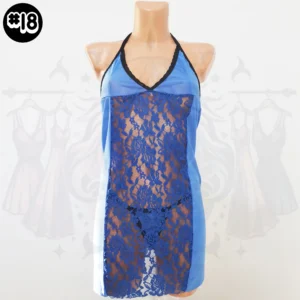 بيبي دول على شكل قميص نوم شوميز و سليب داخلي جي-سترينغ لون اخضر زيتي دونتيل و تيل، مجموعة لانجري تتكون من قميص نوم فضفاض قصير
